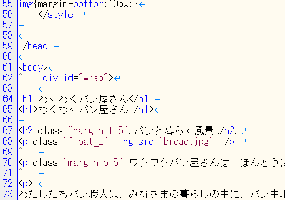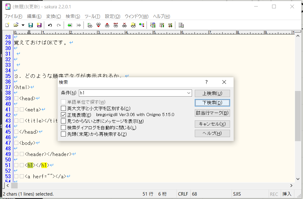 「h1」と入力し「下検索」をクリックすると検索結果に黄色がつく
