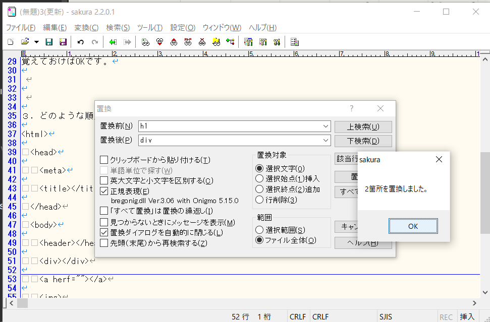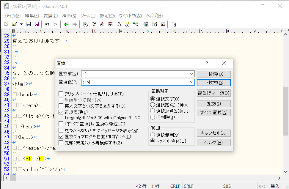 置換前に「h1」、置換後に「div」と入力し「すべてを置換」または「Alt + A」をクリックする。