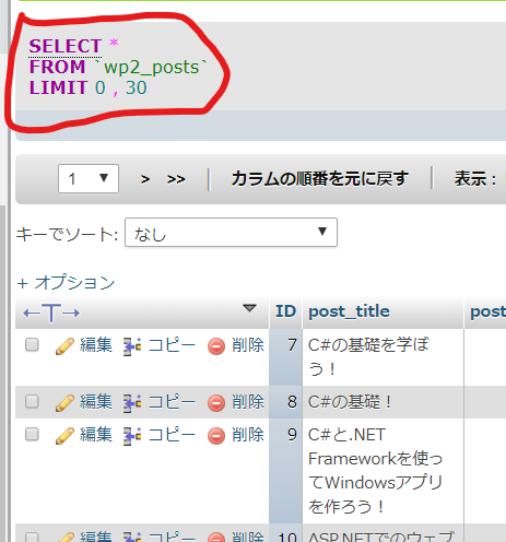 赤枠は検索の「SQL」文です。