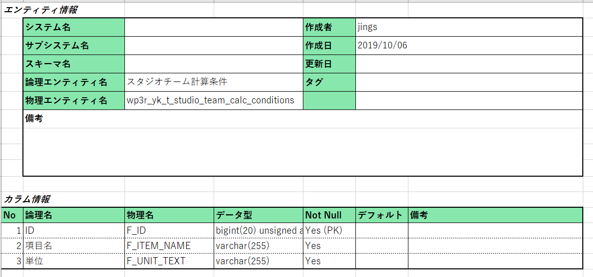 データベースの設計書の例です。こちらもExcelで書かれています。