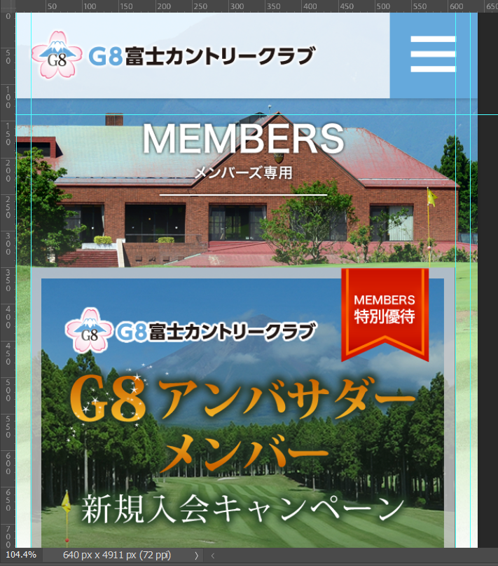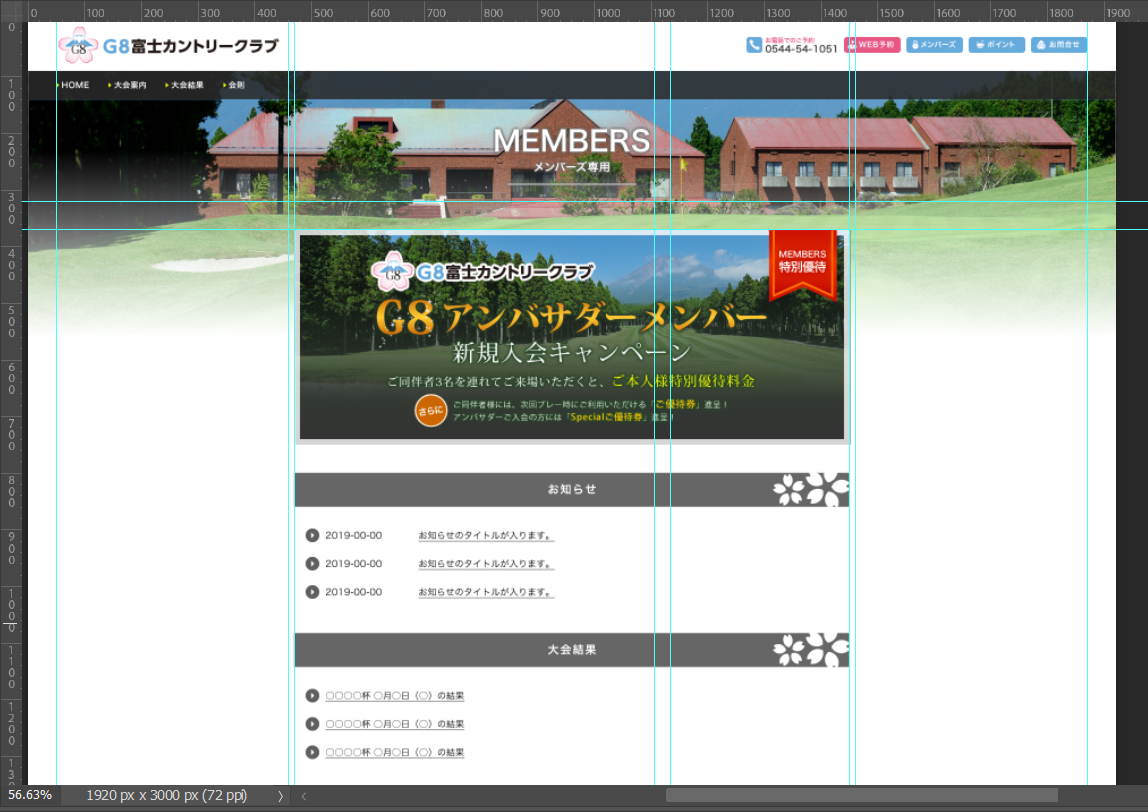 デザインカンプは「デザインの完成見本図」です。「カンプ」や「モックアップ」とも呼ばれます。文章、フォント、文字サイズ、カラー、幅、高さもここで全て決めます。これをスライスしてWEBの部品にします。