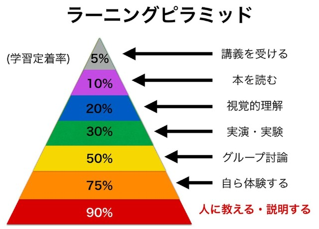 会社に入社してから、プログラミングを学んだが、覚えが悪く上司にも「向いてないよ」と言われていた。そんな時後輩が入社してきて、プログラミングを教えることにことになった。教えているうちに、分からなかった部分が「カチッ」とパズルが埋まるように理解できた瞬間があった。そこから1回学んだことはすぐ覚えられるようになった。後々このラーニングピラミッドの存在を知って、自分は「人に教える」ということで効率良く学習していたという事を知った。