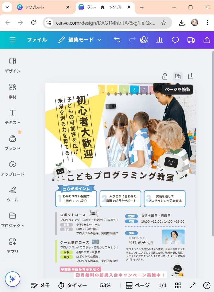 1.「1ページ」タイトルを「見本プログラミング教室」に更新する。