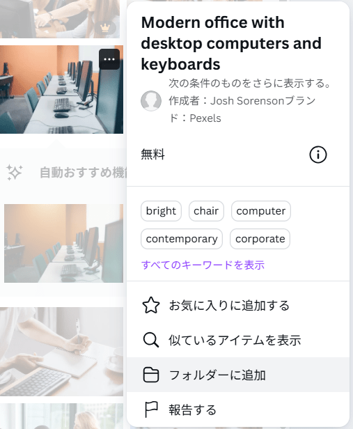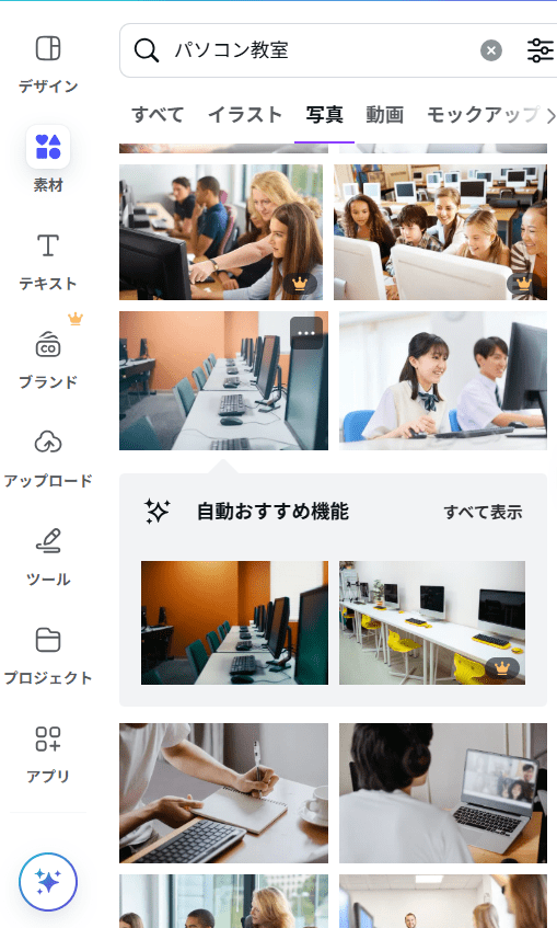 1.素材 > 条件:パソコン教室 > 写真 > 任意の写真の「…」を選択する。