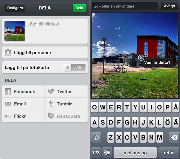 - När man är färdig med redigeringen kan man sätta till undertext, lägga till plats eller tagga personer till sin bild.