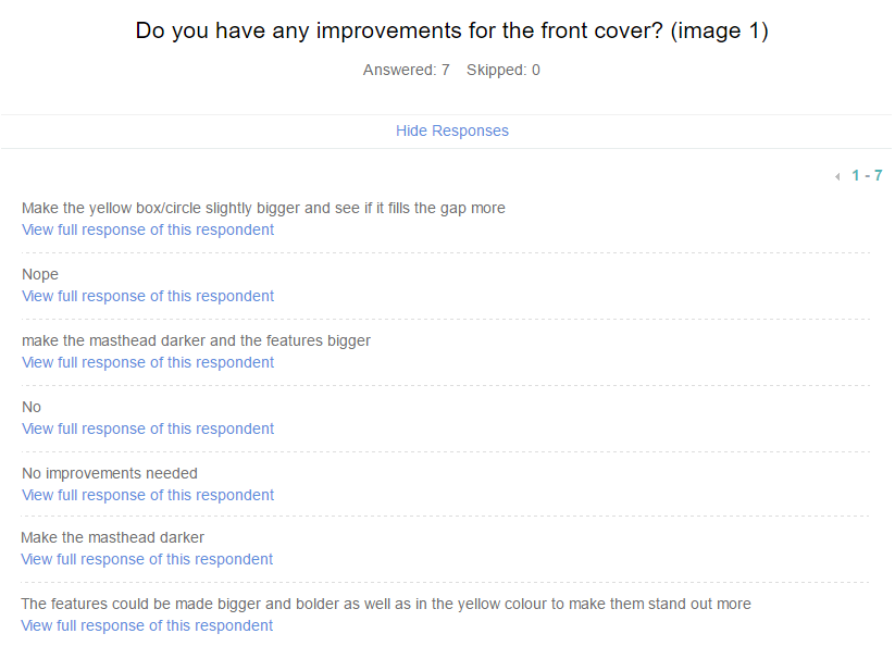 Question 3 asked my audience of any improvements they would make to the front cover of my indie magazine and provided them with space to write down all of their thoughts. There were various comments of how to make my front cover more appealing, including making the masthead darker and bolder, making the features bigger and clearer, etc.