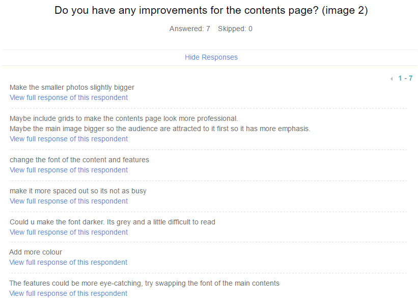 Question 4 asked my audience of any improvements they would make to the contents page of my magazine. Respondents gave advice such as, making the feature images larger and changing the font of the content to make it clearer and bolder. Another response was to add more emphasis to the main image by enlarging it and add grids to the whole page to increase professionalism.