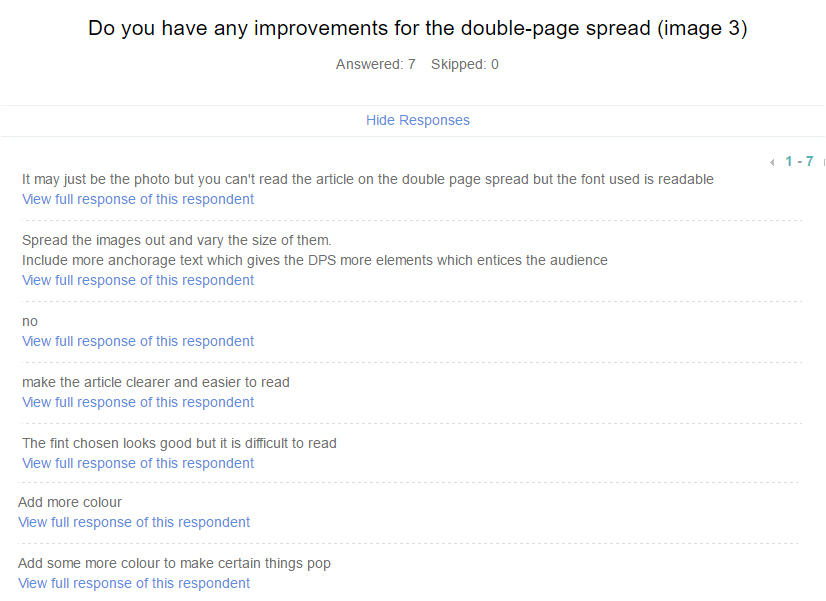 Question 5 asked my audience of any improvements they would make to the double-page spread. There were a lot of comments about the font of the article itself and how it wasn't very clear or easy to read. As a result of these comments I will improve my article page by changing the font. As well as this I will add more colour to the page and vary the size of the images I have used.