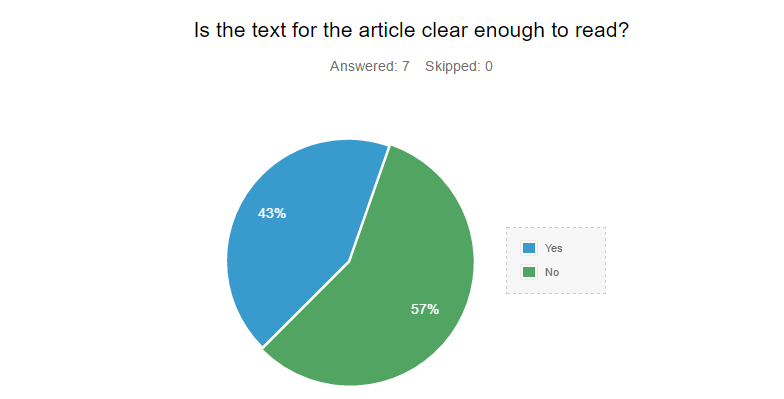 Question 7 is related to the responses of question 5 because asked my audience if they thought the article was clear enough to read and, as predicted from the results of question 5, over half of respondents replied no. Because of these results I will enlarge the font size of my article or change the font so that it is much clearer.