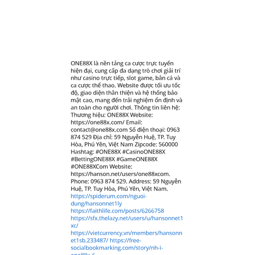 Website: https://hanson.net/users/one88xcomhttps://hanson.net/users/one88xcom ONE88X là nền tảng ca cược trực tuyến hiện đại, cung cấp đa dạng trò chơi giải trí như casino trực tiếp, slot game, bắn cá và ca cược thể thao. Website được tối ưu tốc độ, giao diện thân thiện và hệ thống