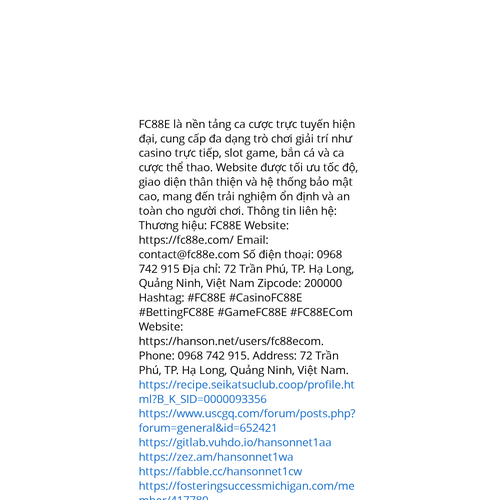 Website: https://hanson.net/users/fc88ecom. FC88E là nền tảng ca cược trực tuyến hiện đại, cung cấp đa dạng trò chơi giải trí như casino trực tiếp, slot game, bắn cá và ca cược thể thao. Website được tối ưu tốc độ, giao diện thân thiện và hệ thống bả