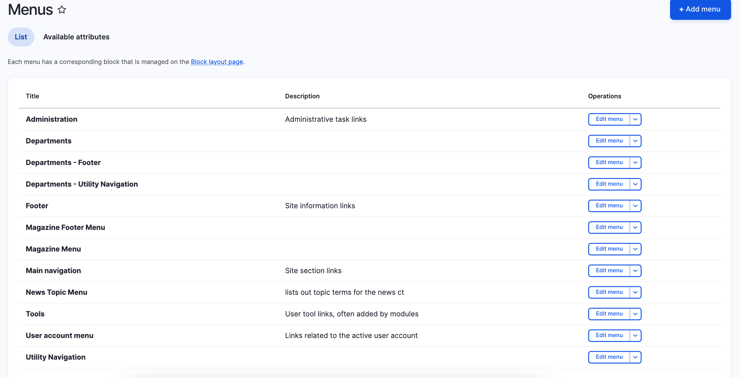 - The Menu Administration screen allows you to add new menus that can be managed by clicking through to the Block Administration page. To get to this page, go to Structure and then click on Menus
