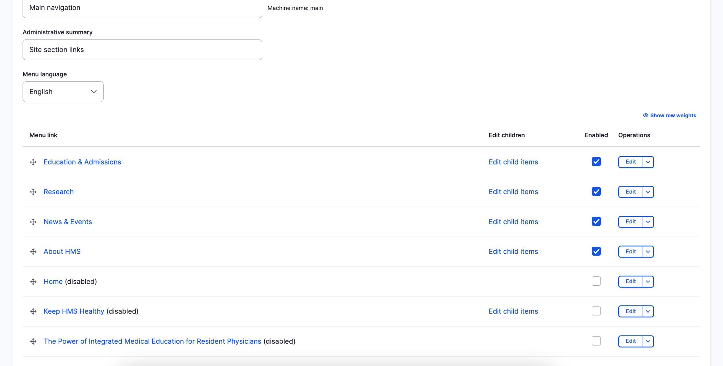 - The 'Main Navigation' contains links for the primary site navigation. List, edit or add links from this screen.