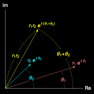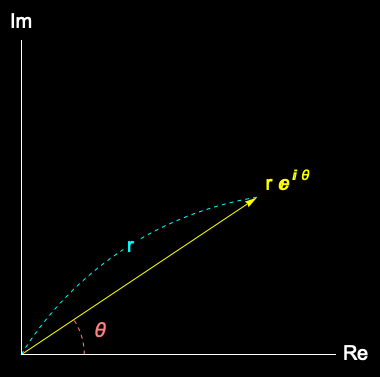 極形式表示はオイラーの公式 \(r e^{i \theta} = r (\cos\theta + i \sin\theta)\) により簡単に表せる。