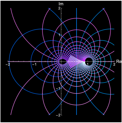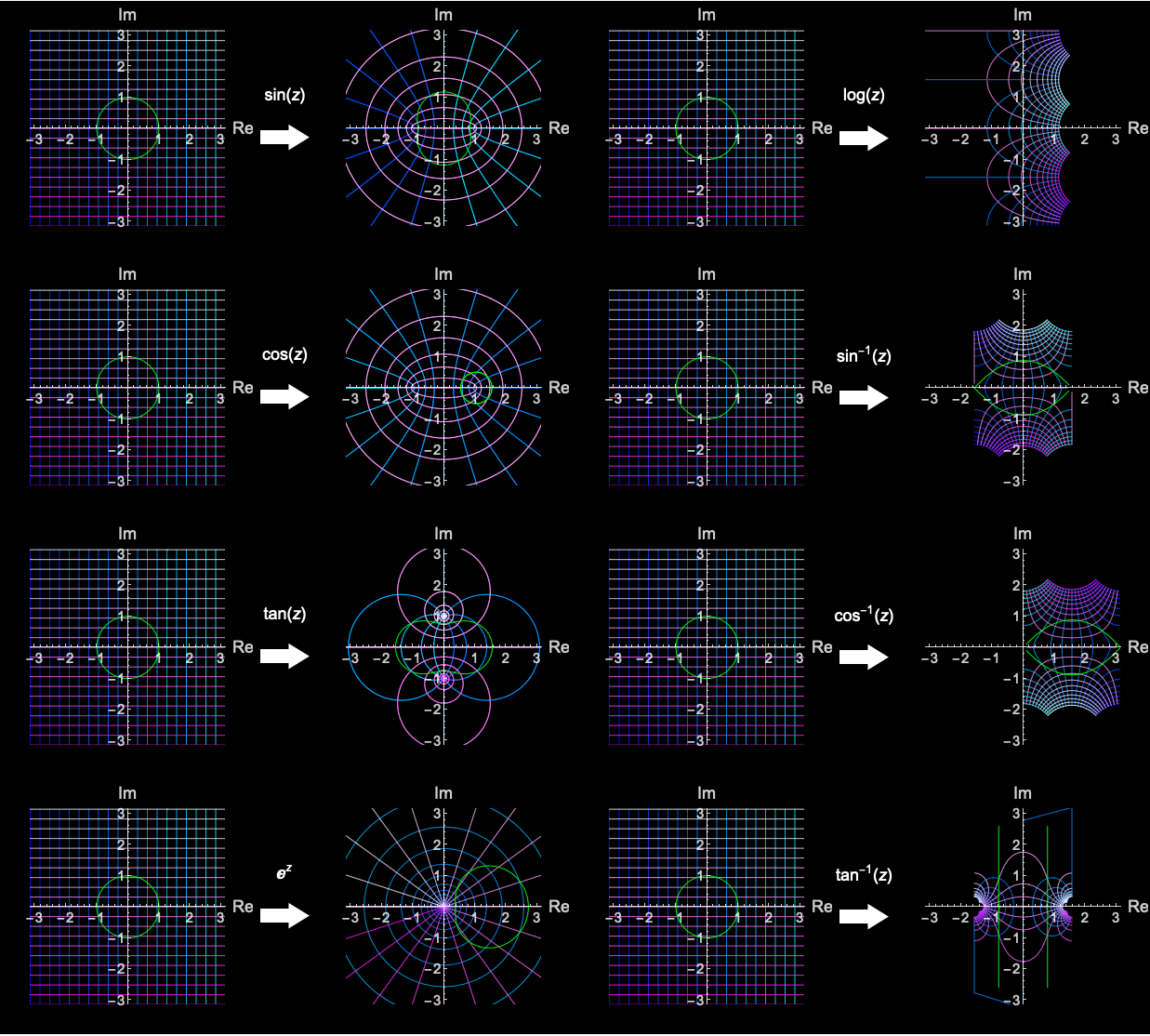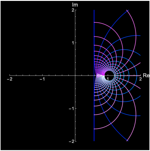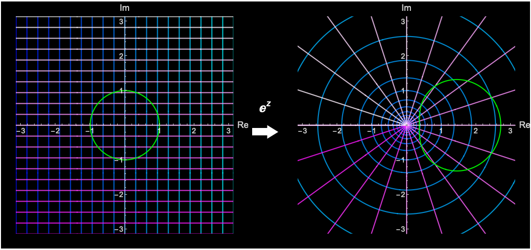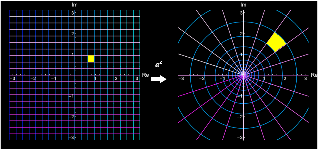 例:\( f(z) = e^z\) による変換では、直交座標が極座標(ただし径方向の目盛りは等間隔でない)に変換される。
