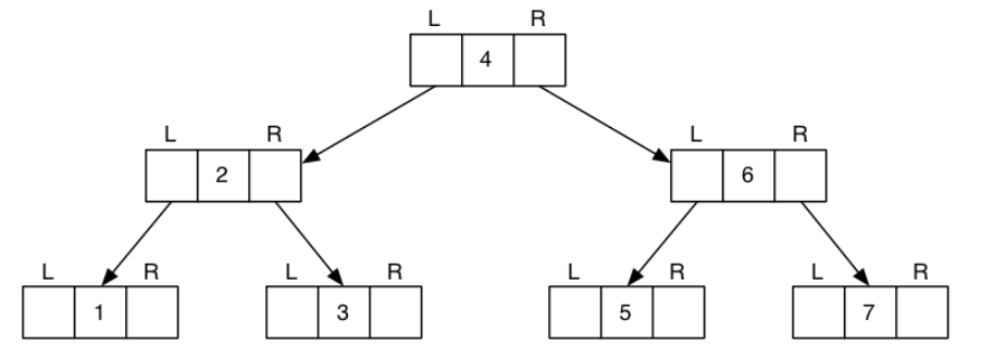This BST is initially empty, then we insert [4, 2, 6, 5, 1, 7, 3] in that order.