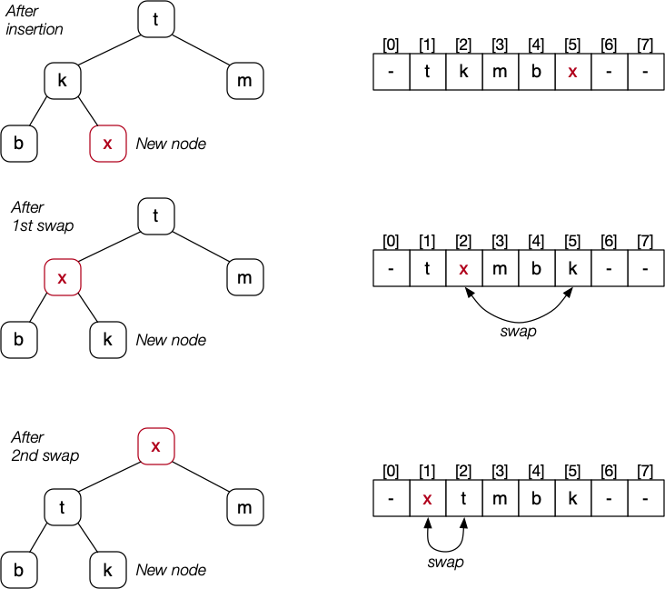 - New items are added in level order to the next available position on the bottom row. After added, they then "drift up" to appropriate level in tree