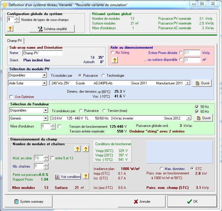 • Sélection du l'onduleur . • Nombre de modules et de chaines.