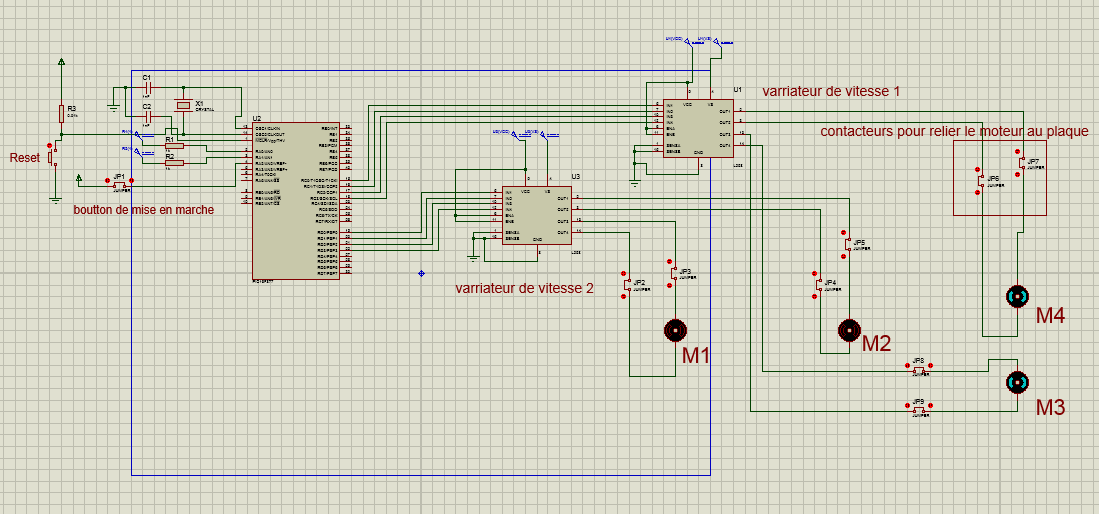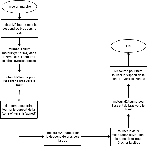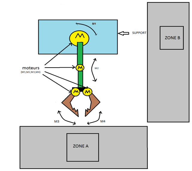 Notre Robot permet de déplacer une pièce qui se trouve dans une zone ‘A’ vers une autre zone ‘B’ à l’aide de quatre moteurs, comme ça montre le schéma suivant :