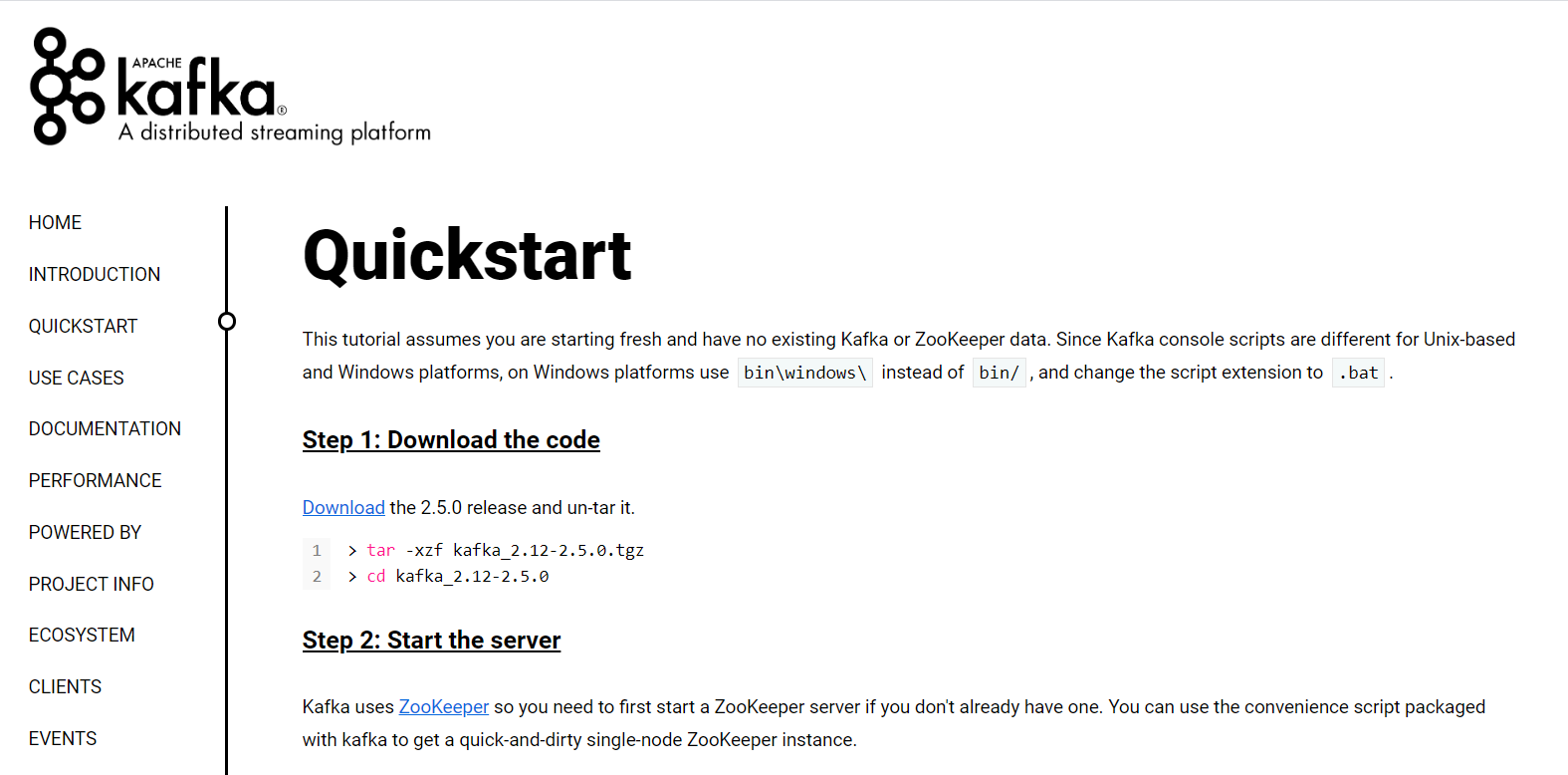 A documentação do Apache Kafka possui um QuickStart muito didático. Portanto, nos guiaremos a partir dele.