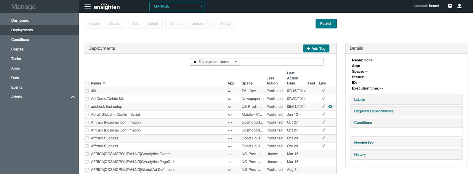 Ensighten uses 3 areas (deployments, conditions and spaces) of the platform to manage the delivery of global javascript through the bootstrap that is included on Hearst websites
