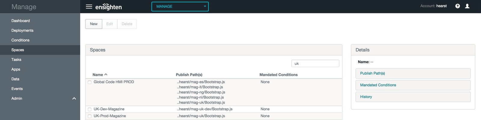 Each country has its own space, which allows us manage deployments for specific countries in Ensighten admin and control which deployments are served to a website with the below JS bootstrap.