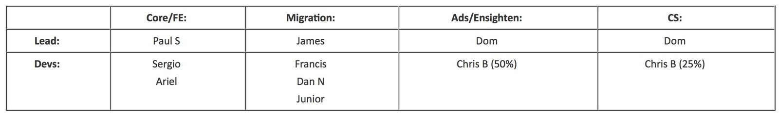 Working to 2 week sprint each stream will include a Tech Lead that will manage the team and development for that stream. The leads/devs are not locked into these stream and can change from sprint to sprint and will be reviewed at the end of the sprint.
