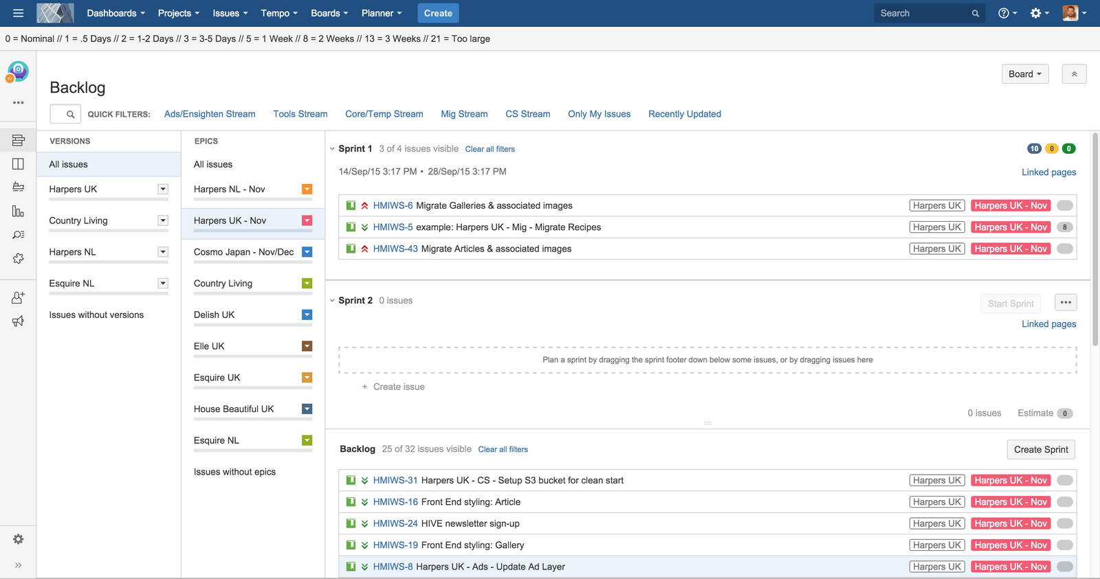 To create more visibility and streamline the DEV stream model we are moving towards a global board that uses EPICs for brands with filtering of streams with components/labels/fix versions