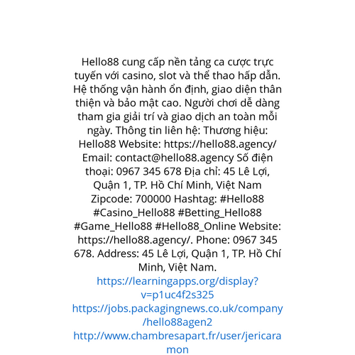 Website: https://hello88.agency/. Hello88 cung cấp nền tảng ca cược trực tuyến với casino, slot và thể thao hấp dẫn. Hệ thống vận hành ổn định, giao diện thân thiện và bảo mật cao. Người chơi dễ dàng tham gia giải trí và giao dịch an toàn mỗi ngày.