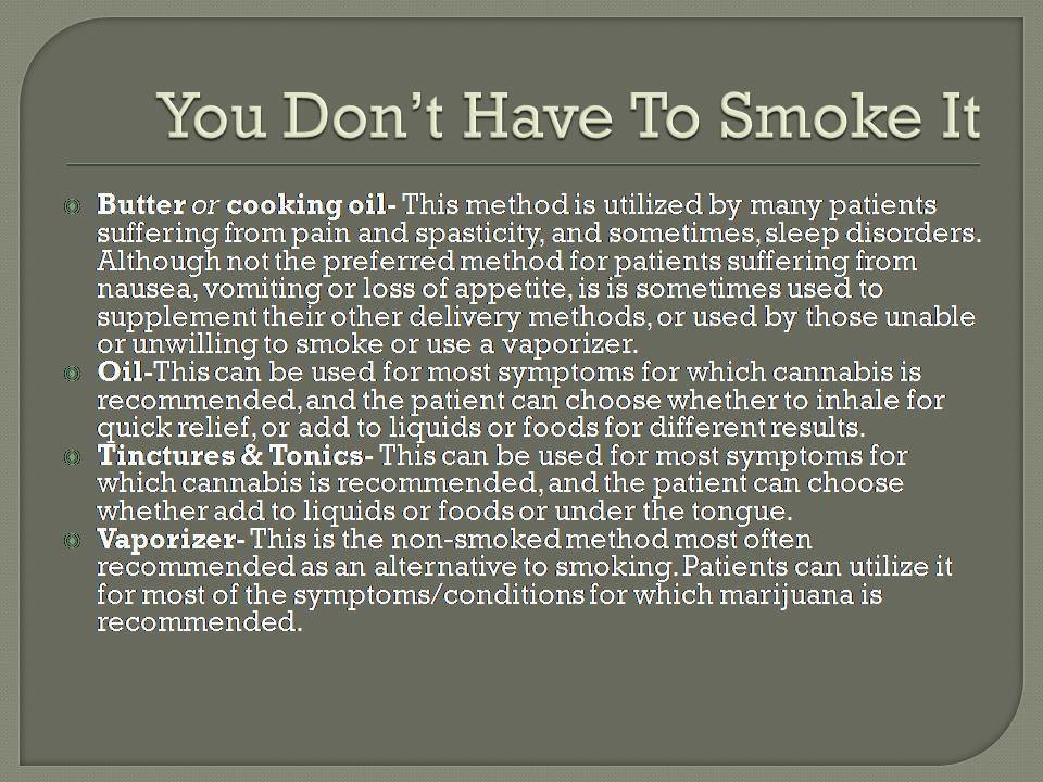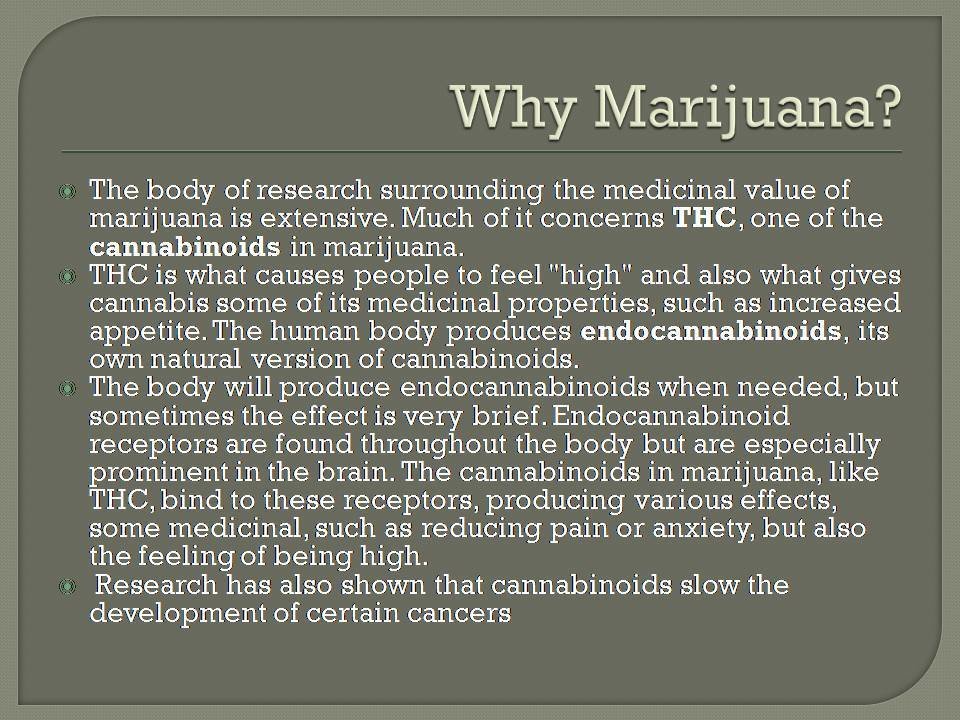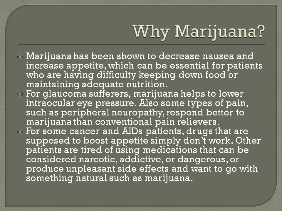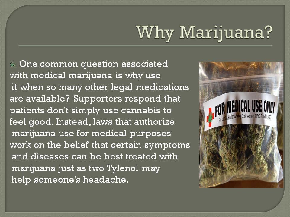 Supporters respond that patients don't simply use cannabis to feel good. Instead, laws that authorize marijuana use for medical purposes work on the belief that certain symptoms and diseases can be best treated with marijuana just as two Tylenol may help someone's headache.