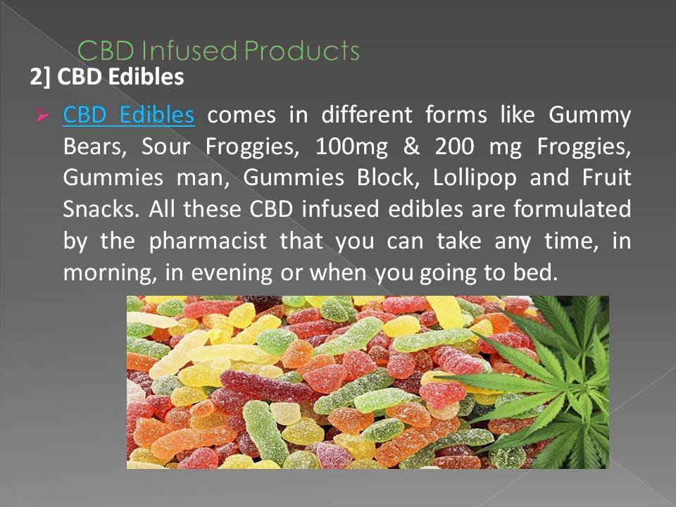 CBD Edibles comes in different forms like Gummy Bears, Sour Froggies, 100mg & 200 mg Froggies, Gummies man, Gummies Block, Lollipop and Fruit Snacks.
