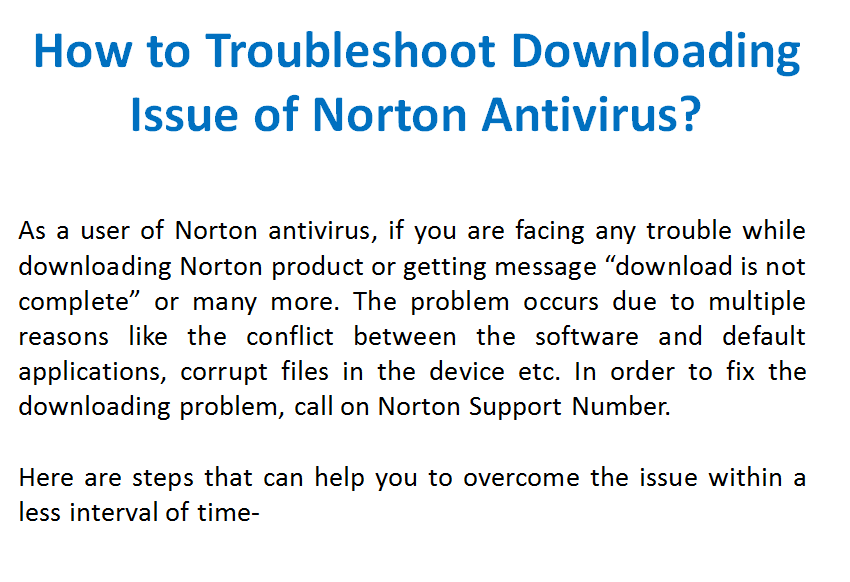 If you are facing any trouble while downloading Norton product or getting the message “download is not complete” etc. You need not worry, in order to fix the downloading problem manually, just call on Norton Support Number +1-800-589-0948 to get instant help from the skilled technicians. Visit: https://goo.gl/cgrgnX