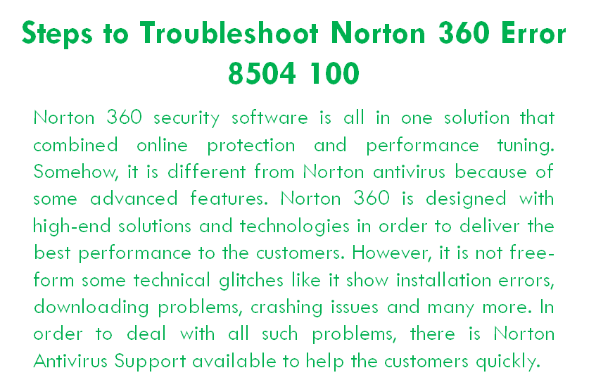 If you are facing numeric error code 8504 100 with your Norton 360, then you must have to fix it quickly. Contact Norton Antivirus Support Number +1-800-439-2178 to have an immediate repair for the Norton product. http://norton-antivirus.technicalsupportservicesinc.com/