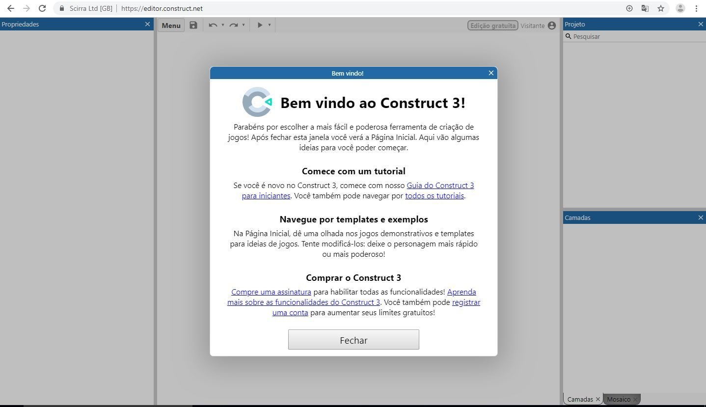 O Construct 3 é executado diretamente no seu navegador. Não há nada para baixar ou instalar! Basta visitar o editor.construct.net no seu navegador em um sistema suportado e o Construct 3 será iniciado. Isso facilita a alternância de dispositivos, o uso de terminais públicos de computadoresou a implantação sem constrangimentos do Construct 3 em um laboratório ou escritório de informática.