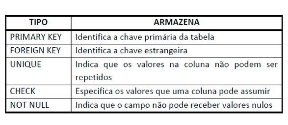 Observe a seguir as principais constraints ou restrições utilizadas nos bancos de