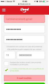Ex: quando tentei fazer um cadastro no iFood para pedir uma feijoada no sábado (porque ninguém é de ferro), digitei meu endereço de e-mail errado. Logo apareceu uma mensagem de erro, sinalizando o que estava errado e onde deveria consertar meu erro para seguir com o meu pedido.