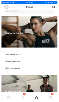 Ex: quando eu acesso o app do Nike Training (para ajudar naquela promessa de emagrecer), vejo um layout simples, que direciona as minhas escolhas. Na primeira tela, eu decido entre fazer o que ele me sugere (no topo) ou buscar um treino. Quando escolho buscar um treino, ele me oferece muito claramente opções para atingir o meu objetivo.