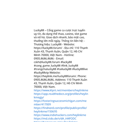 Website: https://heylink.me/lucky88forum/. Lucky88 – Cổng game ca cược trực tuyến uy tín, đa dạng thể thao, casino, slot game và nổ hũ. Giao dịch nhanh, bảo mật cao, thưởng lớn mỗi ngày. Thông tin liên hệ: - Thương hiệu: Lucky88 - Website: https://l