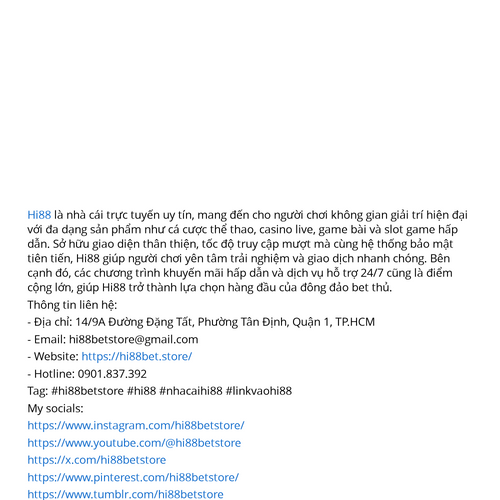 Hi88 là nhà cái trực tuyến uy tín, mang đến cho người chơi không gian giải trí hiện đại với đa dạng sản phẩm như cá cược thể thao, casino live, game bài và slot game hấp dẫn. - Website: https://hi88bet.store/