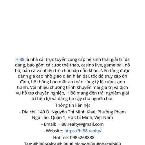 HI88 là nhà cái trực tuyến cung cấp hệ sinh thái giải trí đa dạng, bao gồm cá cược thể thao, casino live, game bài, nổ hũ, bắn cá và nhiều trò chơi hấp dẫn khác. - Website: https://hi88.realty/