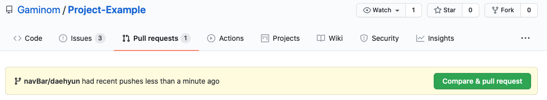 github 저장소 Pull requests 탭에 들어가보면 create pull request 라는 초록 버튼이 활성화 되어있다.