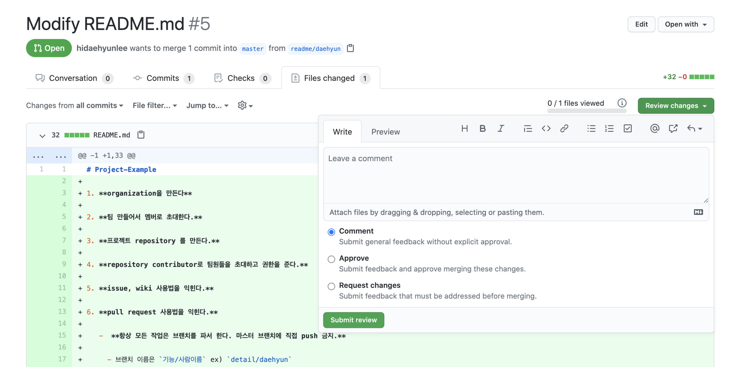 Request changes : 코드에서 버그를 발견하면 다시 수정해달라고 요청할 수 있음.