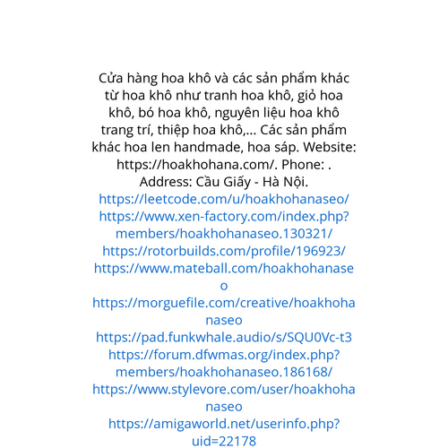 Website: https://hoakhohana.com/https://hoakhohana.com/ Cửa hàng hoa khô và các sản phẩm khác từ hoa khô như tranh hoa khô, giỏ hoa khô, bó hoa khô, nguyên liệu hoa khô trang trí, thiệp hoa khô,... Các sản phẩm khác hoa len handmade, hoa sáp. Phone: . Address: Cầu Giấy -