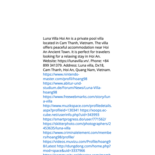 Website: https://lunavilla.vn/https://lunavilla.vn/ Luna Villa Hoi An is a private pool villa located in Cam Thanh, Vietnam. The villa offers quiet accommodation near An Bang Beach. It is perfect for families looking for a relaxing stay in Hoi An. Phone: +84 899 3413