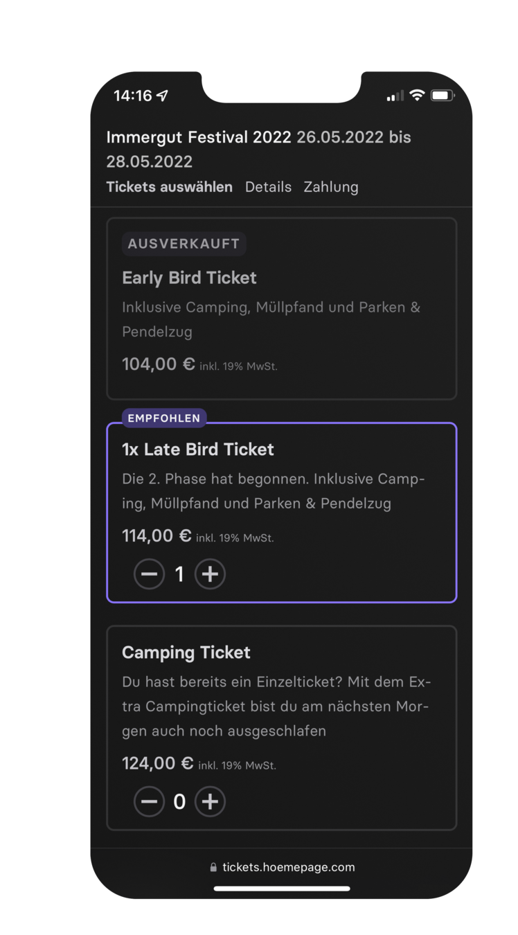 Ein Whitelabel Design mit eurem Festival im Vordergrund. Direkt auf eurer Webseite integriert.