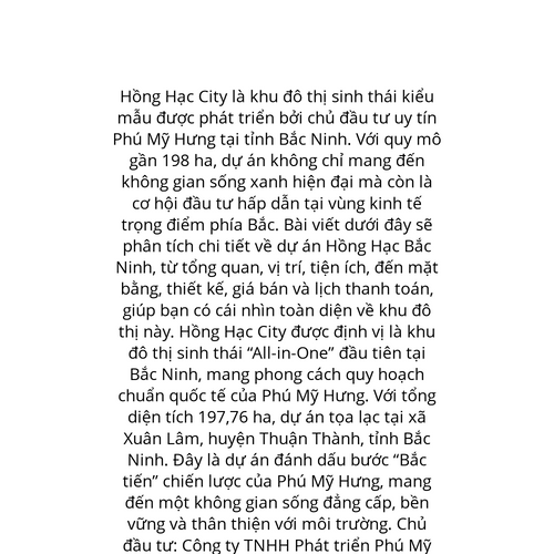 Website: https://phumyhungreals.com.vn/du-an/hong-hac-city-phu-my-hung/. Hồng Hạc City là khu đô thị sinh thái kiểu mẫu được phát triển bởi chủ đầu tư uy tín Phú Mỹ Hưng tại tỉnh Bắc Ninh. Với quy mô gần 198 ha, dự án không chỉ mang đến không gian số