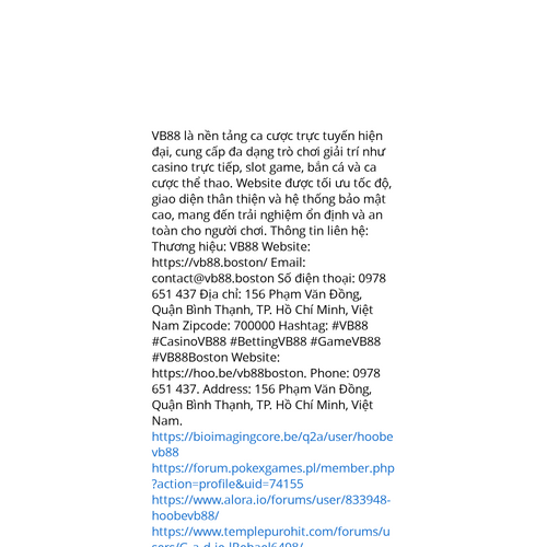 Website: https://hoo.be/vb88boston. VB88 là nền tảng ca cược trực tuyến hiện đại, cung cấp đa dạng trò chơi giải trí như casino trực tiếp, slot game, bắn cá và ca cược thể thao. Website được tối ưu tốc độ, giao diện thân thiện và hệ thống bảo mật cao