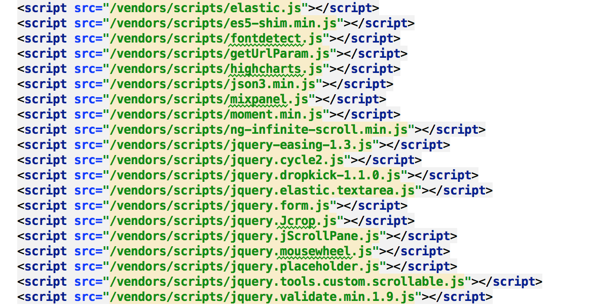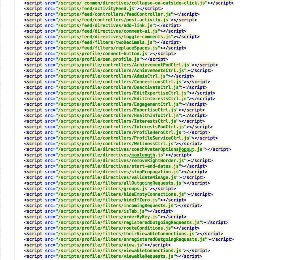 <!-- build:js /scripts/profile.js --> <script src="/scripts/feed/activityFeed.js"></script> <script src="/scripts/feed/controllers/feedController.js"></script> <script src="/scripts/feed/controllers/post-activity.js"></script> <script src="/scripts/feed/directives/add-link.js"></script> <script src="/scripts/feed/directives/comment-ui.js"></script> <script src="/scripts/feed/directives/toggle-comments.js"></script> <script src="/scripts/feed/filters/twoDecimals.js"></script> <script src="/scripts/feed/filters/replaceSpaces.js"></script> <script src="/scripts/profile/connect-button.js"></script> <script src="/scripts/profile/zen.profile.js"></script> <script src="/scripts/profile/controllers/AchievementPodCtrl.js"></script> <script src="/scripts/profile/controllers/AchievementsCtrl.js"></script> <script src="/scripts/profile/controllers/AdminCtrl.js"></script> <script src="/scripts/profile/controllers/ConnectionsCtrl.js"></script> <script src="/scripts/profile/controllers/DeactivateCtrl.js"></script><!-- endbuild -->