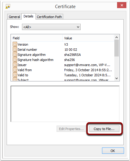 9. From the Certificate Properties window, click the Details tab and click Copy to File