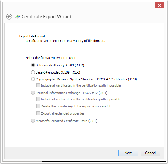 10. Select the "DER encoded binary X.509 (.CER)" option and click Next